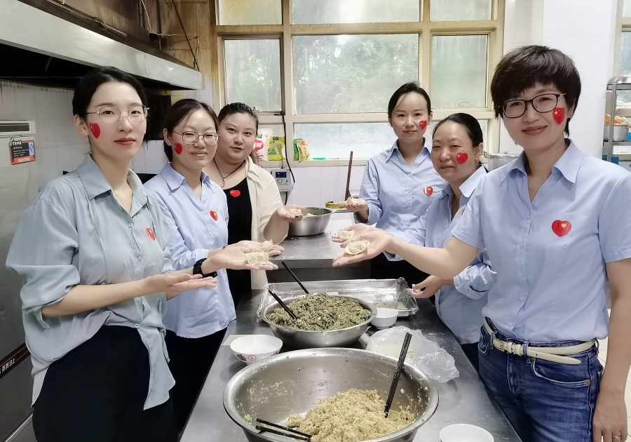 食堂里,師傅們?cè)缫褱?zhǔn)備好了餡料和餛飩皮,就等著包餛飩能手們大展身手。將餛飩皮攤在手心,舀上餡料,一折一捏,一個(gè)美觀飽滿的餛飩就包好了。在大家的巧手下,滿滿幾大盆的餡料很快見底,取而代之的是一盤盤美味可口的餛飩。