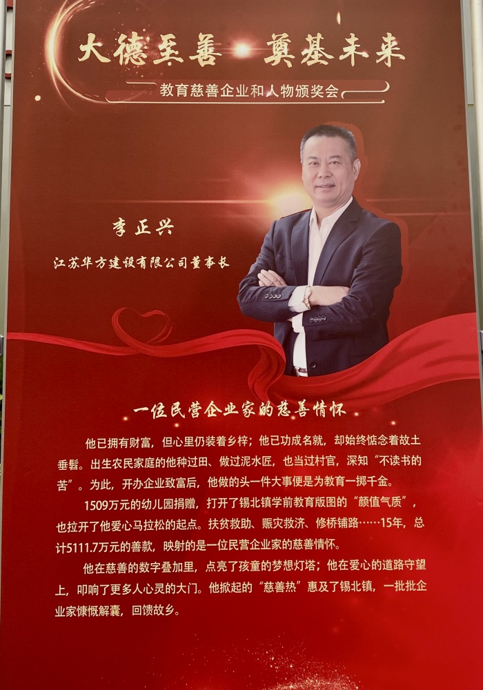 江蘇華方建設有限公司李正興董事長榮獲“無錫教育慈善人物”榮譽稱號,華方建設黨支部書記、副董事長李燕嵐女士作為代表接受表彰。