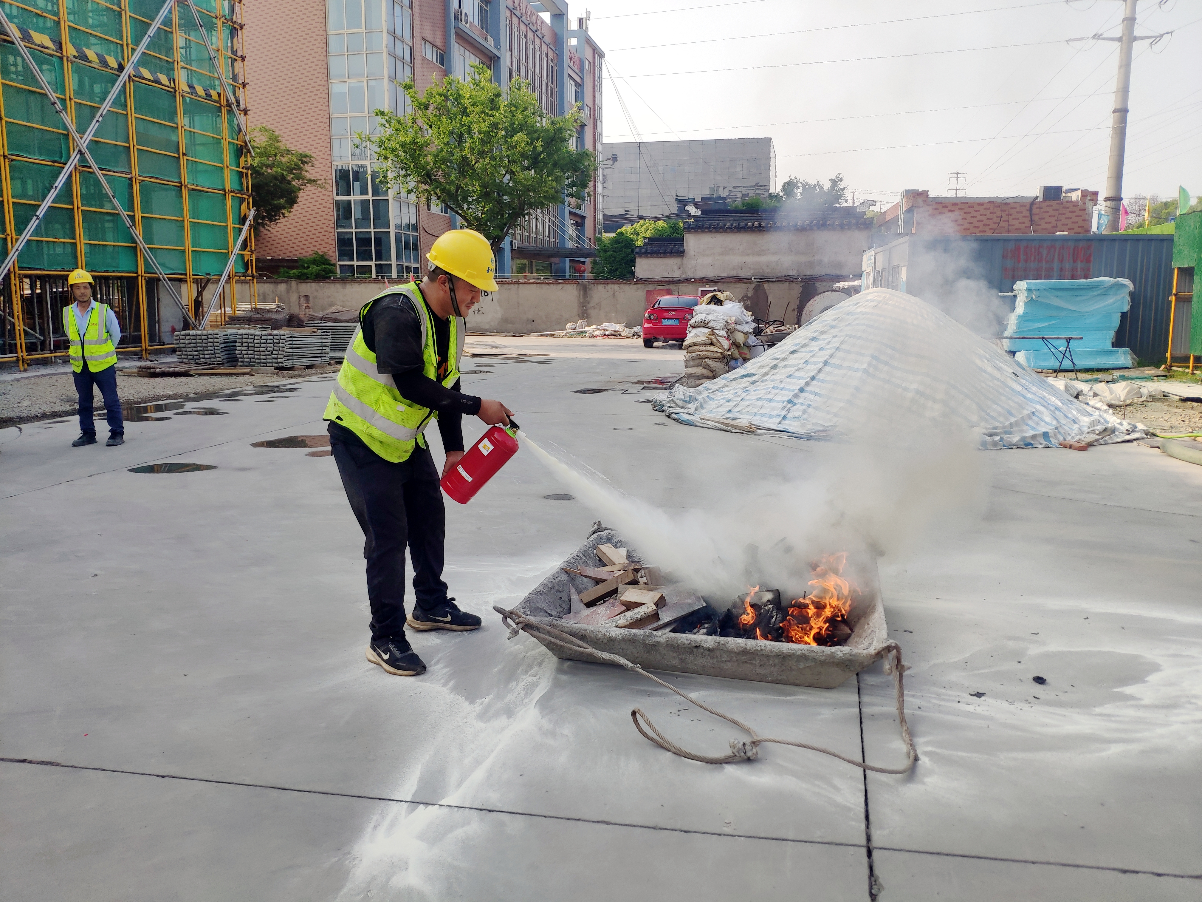 項目經理組織大家進行消防器械滅火實操,過程中大家積極參與,并嚴格按照步驟進行現場模擬滅火。