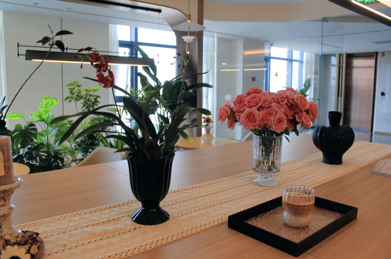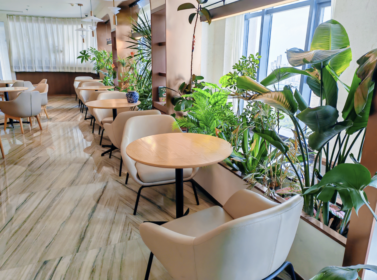 明亮的落地窗將城市的喧囂演繹成流動的背景,室內柔和的燈光、舒適的坐位、點綴的綠植,營造出松弛而溫暖的氛圍。